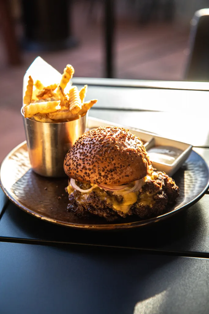 AZ grass-fed and dry aged, Velveeta, red onion, house pickles, toasted onion Kona bun, Aftermath burger sauce
