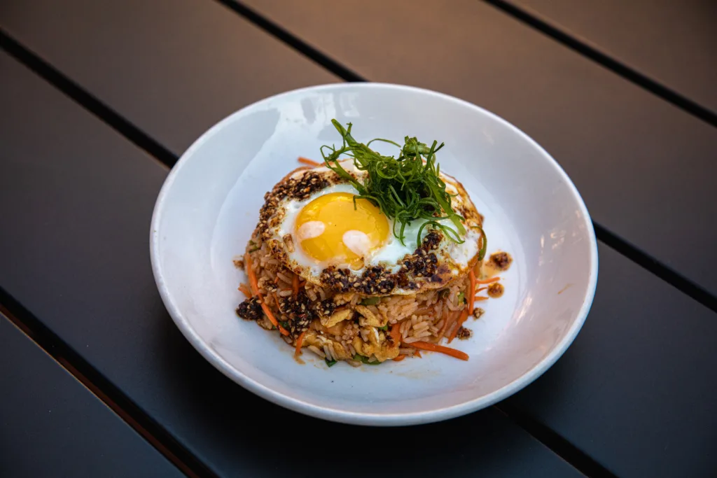 House Kimchi, Jasmine rice, English Peas, Fried Egg